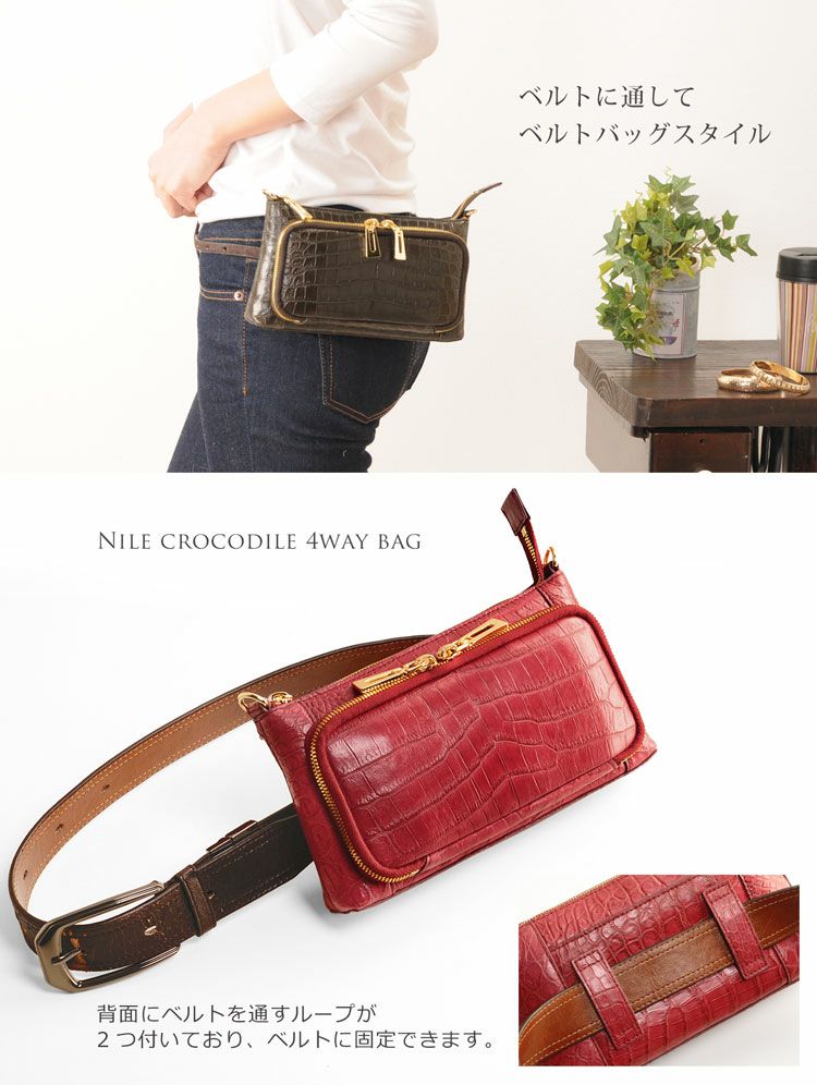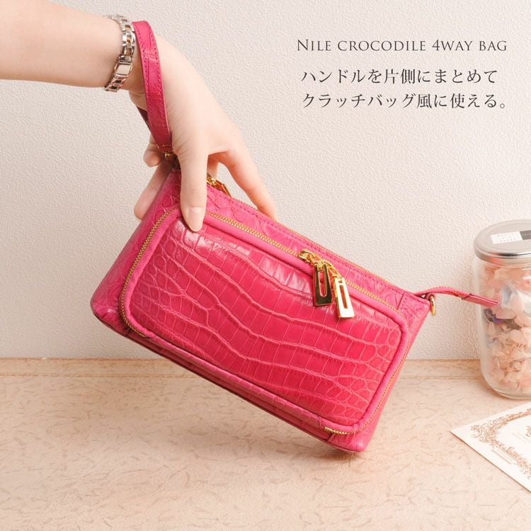 ナイルクロコダイルで仕立てた4WAYで使える軽量ミニバッグ。