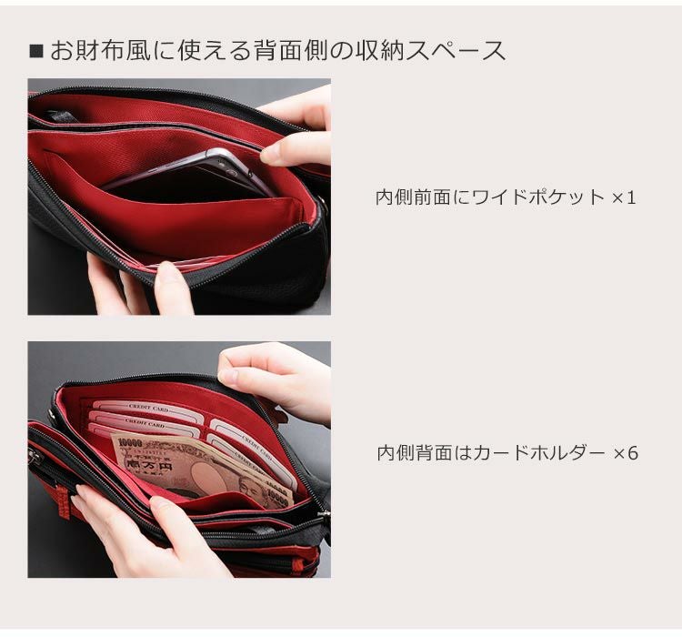 | 内側収納 | ■前面側の収納スペース ・ファスナー付きポケット×1 ・キーホルダーストラップ×1 ■背面側の収納スペース ・ワイドポケット×1 ・カードホルダー×6 ■中央ポケット×1 |