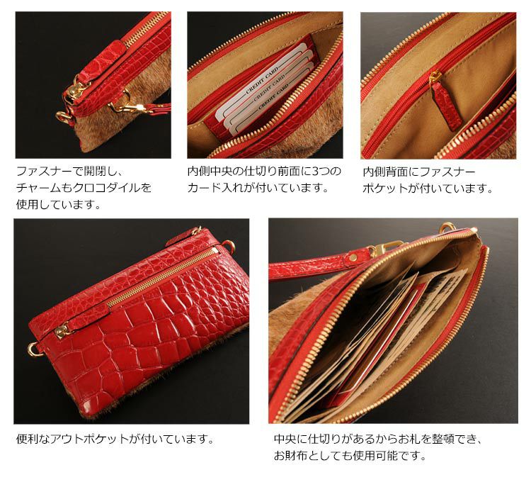 | 素材 | 表側:クロコダイル、キッドラム 内装:牛革、スエード調の生地 |