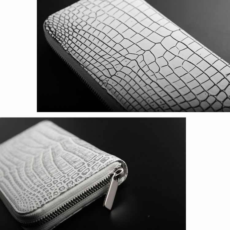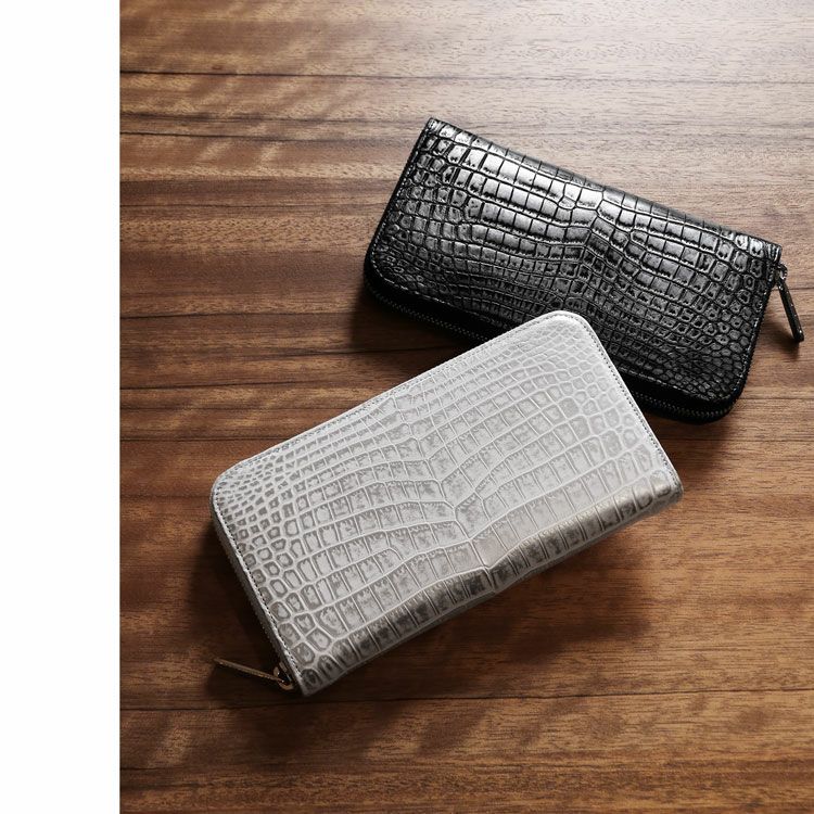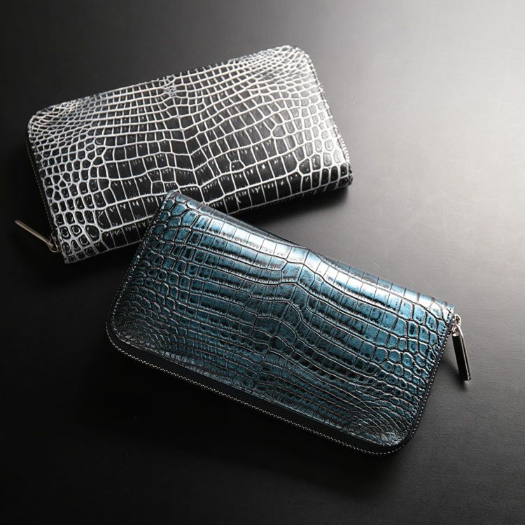 商品名:クロコダイル 長財布 センター取り 一枚革 ラウンドファスナー 日本製 変わり染め JRA メタルファスナー メタリック ブラック ブルー ボルドー ホワイト シルバー
