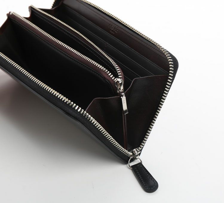 ラウンドファスナーでコの字型に大きく開くファスナー長財布です。