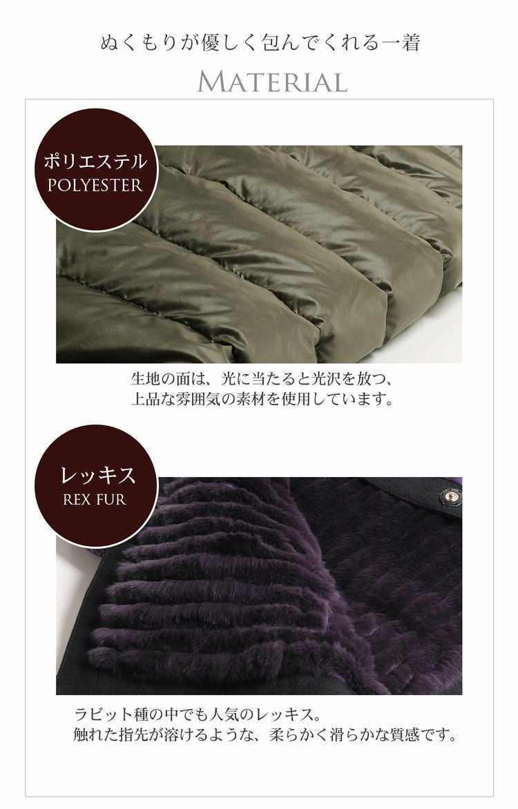 | 素材 | 生地:ポリエステル100% 中綿:ダウン85%、フェザー15% 毛皮:レッキス |