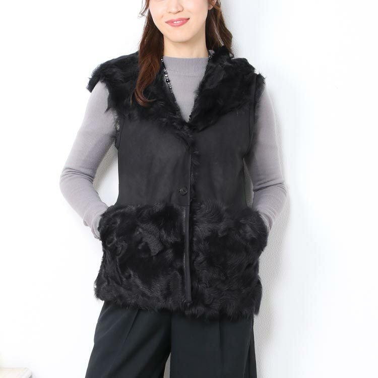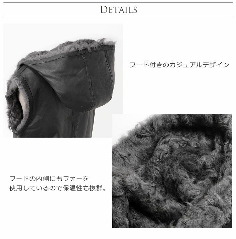 | 商品名:カルガンラム ファー レザー ベスト フード付き / 一枚革 仕立て レディース |