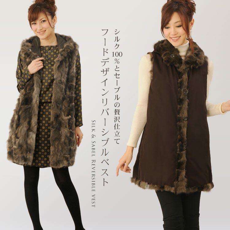 シルク100%&セーブル ロング ベスト リバーシブル フード付き 7F