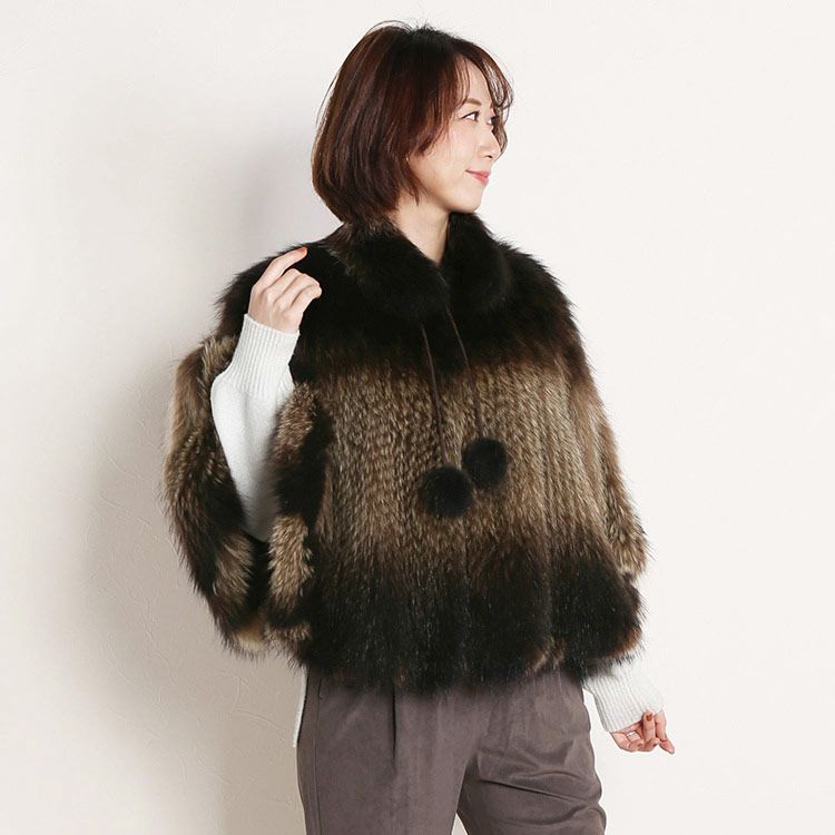 ※キーワード:ファーケープ ファーポンチョ 毛皮 リアルファー アメリカンラクーンファー 編み込み ニット ショート丈 フリーサイズ ゆったり 羽織り アウター 秋 冬