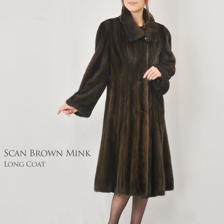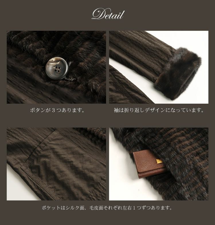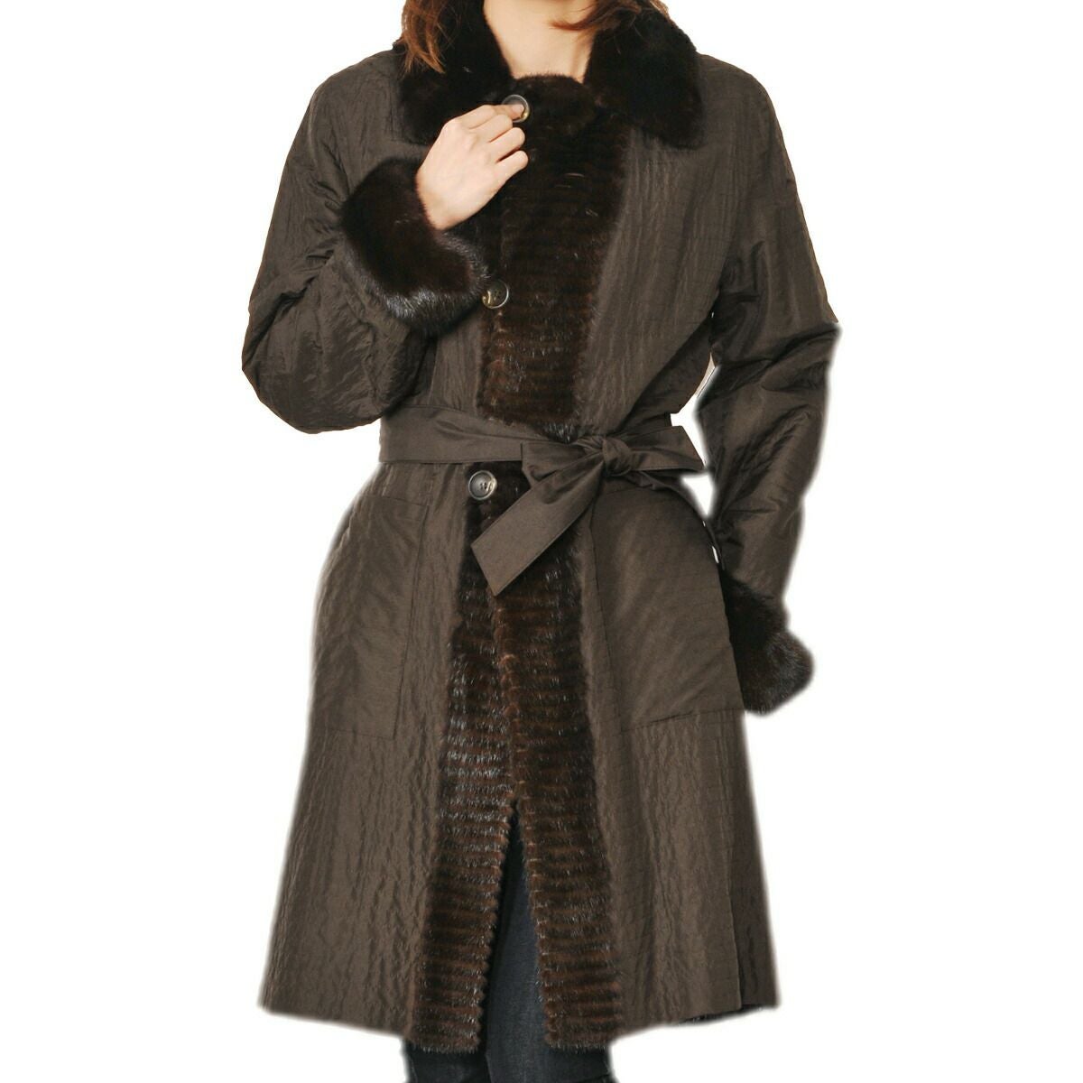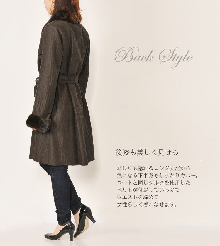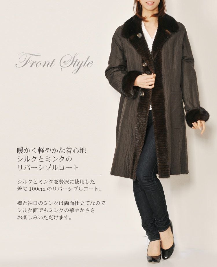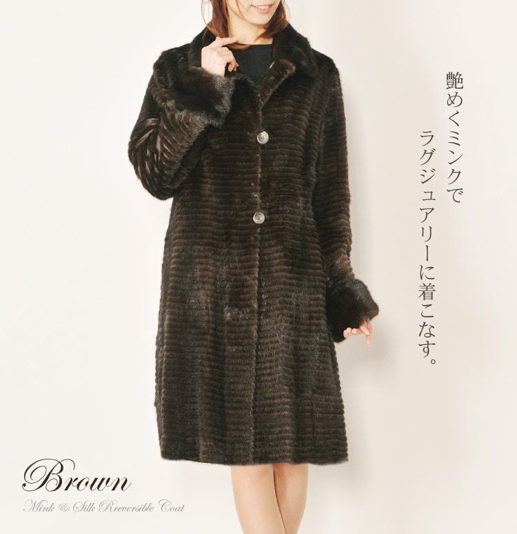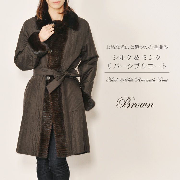 シルク100% ミンク リバーシブル ロングコート ベルト付き ブラウン 7F