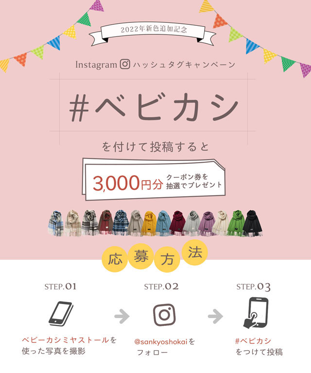 ベビーカシミヤストールを使ったコーデなどの写真を「#ベビカシ」ハッシュタグをつけて、Instagramに投稿すると、抽選で5名様に、3000円分のクーポン券をプレゼント!