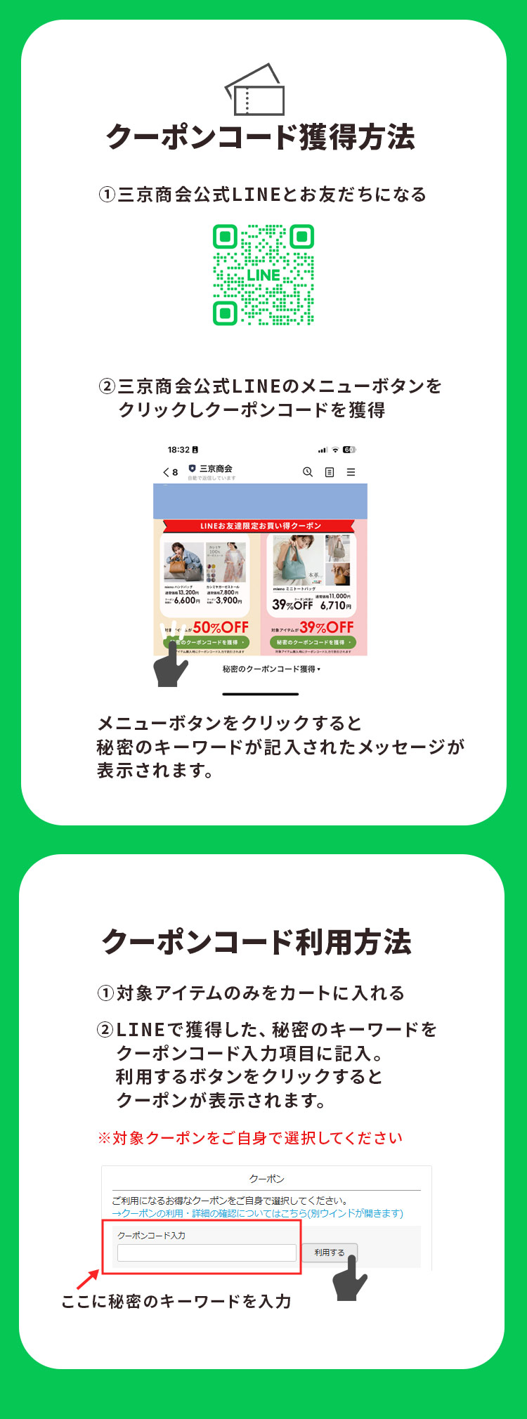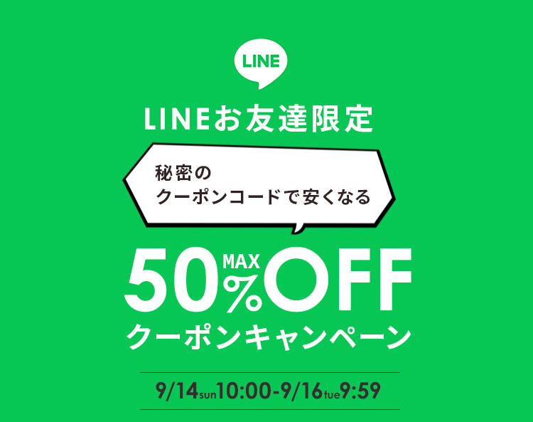 対象アイテム限定 LINEのお友だち登録後、秘密のキーワード獲得で対象アイテムが最大50%OFF! 秘密のキーワード獲得期間:2025年9月12日10:00~9月16日9:59 クーポン利用期間:2025年9月14日10:00~9月16日9:59