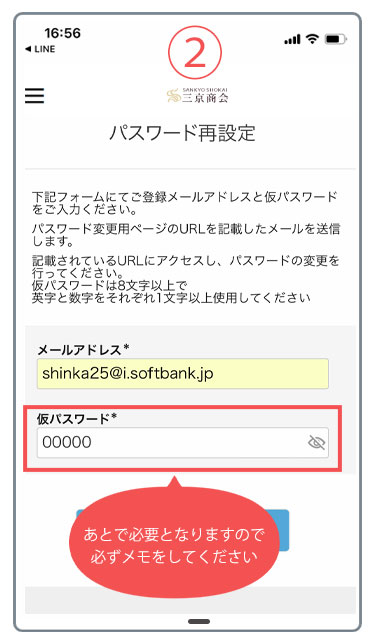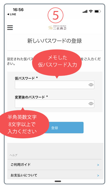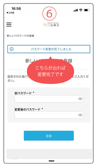 - 4.届いたメールURLをクリックすると下記ページが表示されます。先ほど入力した仮パスワードと、新しいパスワードを入力し、登録ボタンをクリックしてください。