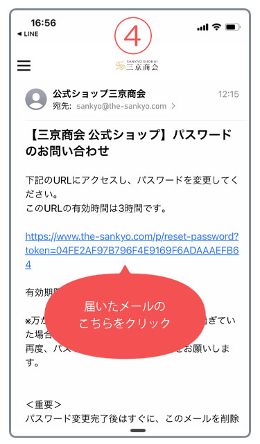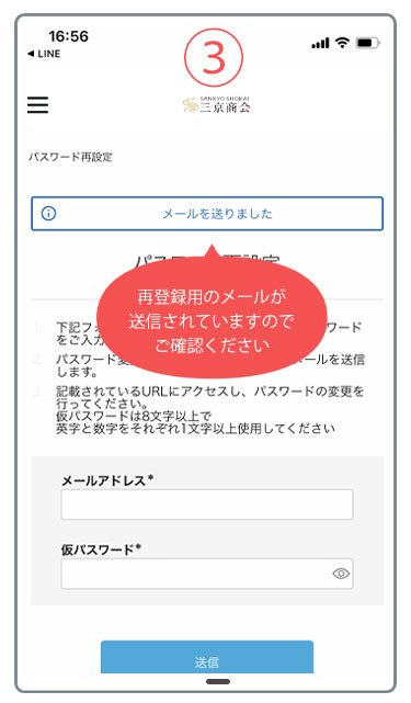 - 3.届いたメールURLをクリックください。有効時間(3時間)を過ぎれば無効となりますのでお手数をおかけしますが最初から手続きをやり直してください。
