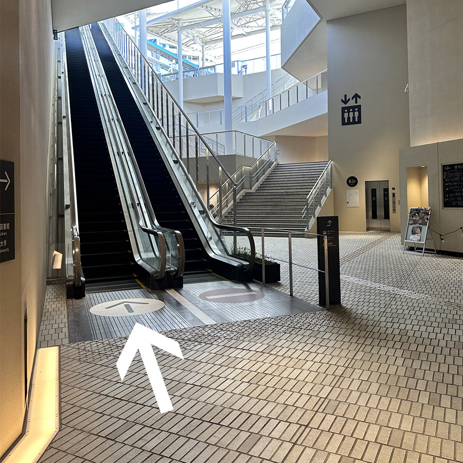 1:箕面船場阪大前駅の改札を出て右側にあるエスカレーター、またはエレベーターを使い、2階へ上がります。