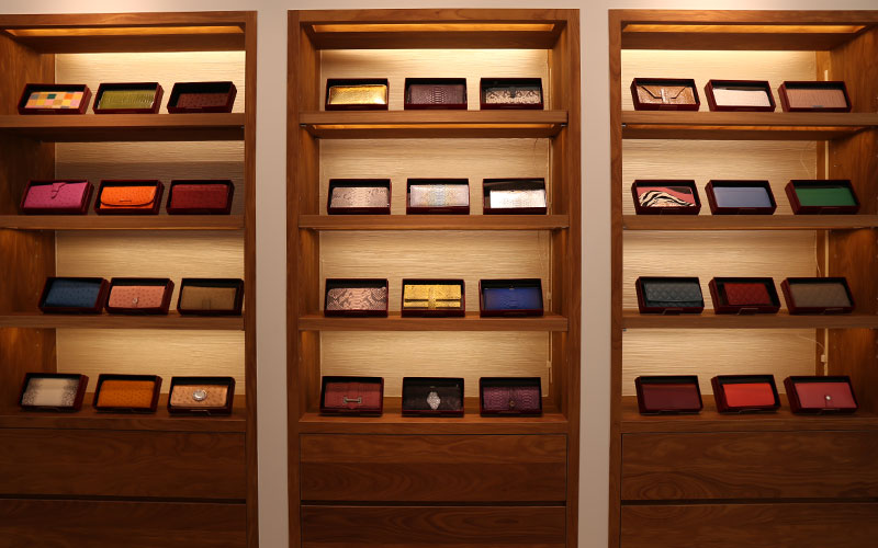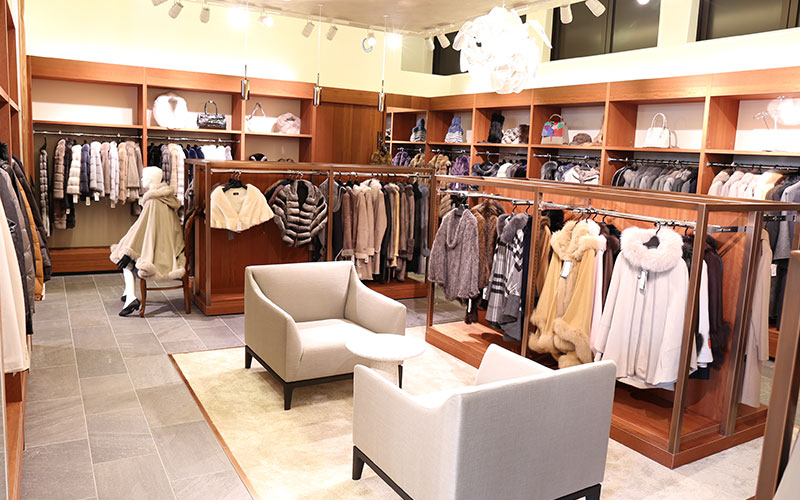 大阪の実店舗では、広いフロアに皮革製品や毛皮製品など多数の商品を展示・販売しております。