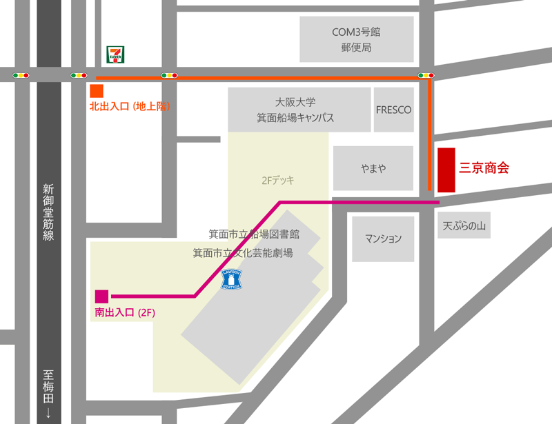 - 3:北大阪急行『箕面萱野駅』から電車に乗車し『箕面船場阪大前駅』にて下車。